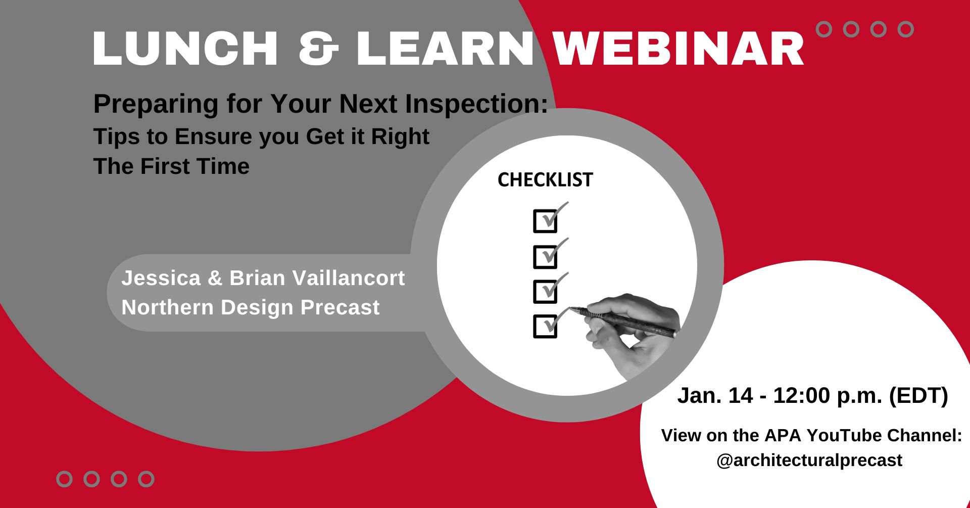 Complimentary Members Only Webinar - January 14, 2026Set yourself up for success and ensure your next inspection goes as smoothly as possible. This session will give you an overview of how to collect and organize key documents, timelines for doing so, a briefing on expectations on the plant floor and more.Presenters:Brian Vaillancourt, QC Manager, Northern Design PrecastJessica Vaillancourt, Production Manager, Northern Design Precast |
